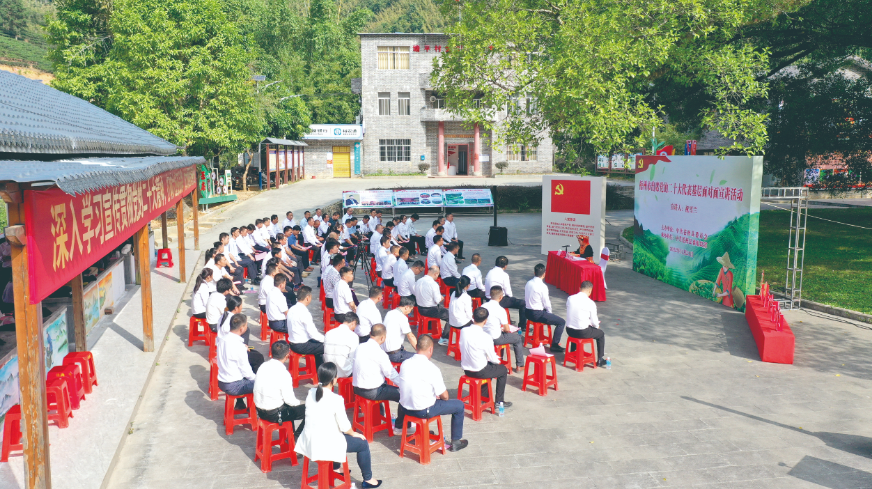 黨的二十大代表、蒼梧縣六堡鎮山坪村黨支部書記祝雪蘭作黨的二十大精神暨習近平新時代中國特色社會主義思想進農村宣講。(蒼梧縣文明辦供圖)