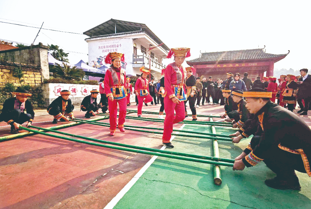 2月16日,在蒙山縣夏宜瑤族鄉六海村木王坪組,瑤族村民正在歡快地跳竹竿舞。 朱元冬 攝