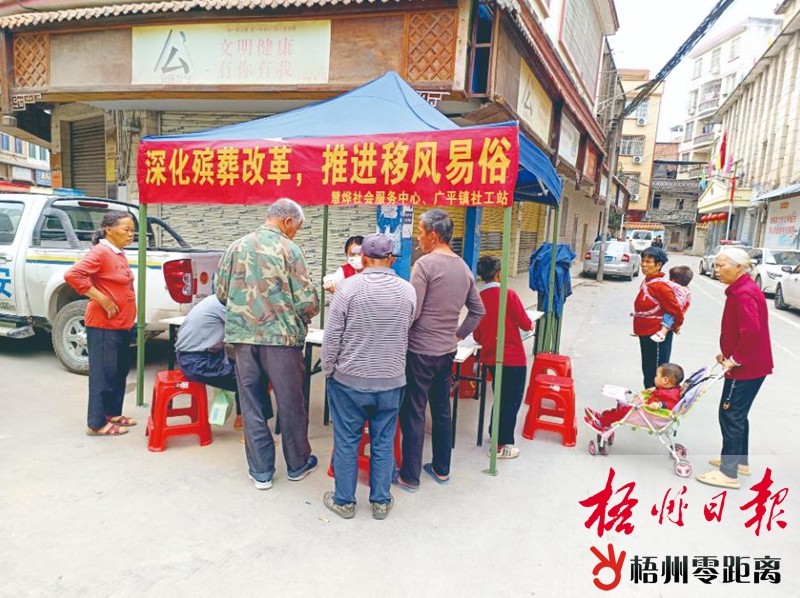 梧州零距離網-梧州日報訊 為進一步推動深化殯葬改革,近日,龍圩區民政局在慧燁社會工作服務中心開展了“深化殯葬改革,推進移風易俗”主題宣傳活動。結合當地圩日人流量多的特點,龍圩區民政局分別在大坡鎮、廣平鎮開展節地生態葬式葬法宣傳、文明低碳祭掃方式宣傳、優秀傳統清明文化宣傳。