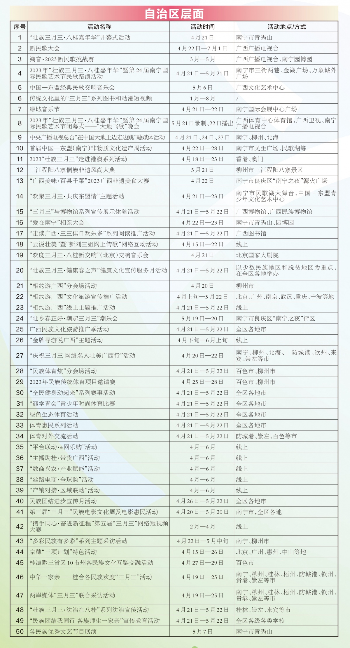 “壯族三月三·八桂嘉年華”文化旅游品牌工作聯(lián)席會(huì)議辦公室精心梳理、遴選300多場(chǎng)有代表性、有特色的活動(dòng)項(xiàng)目在廣西日?qǐng)?bào)等媒體上集中發(fā)布,以便社會(huì)各界廣泛參與,共度八桂嘉年華。更多活動(dòng)資訊敬請(qǐng)關(guān)注各媒體、網(wǎng)站、客戶端。