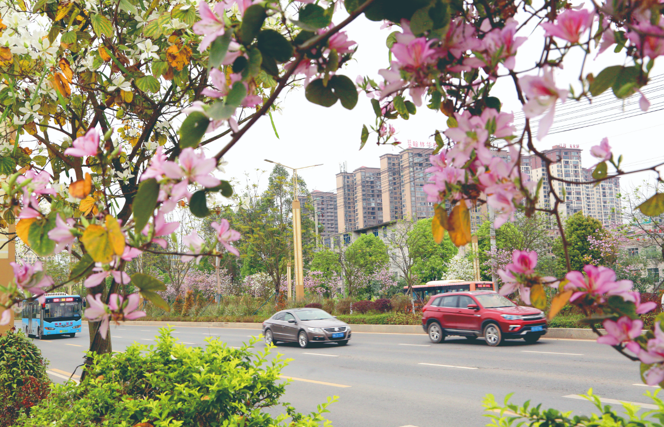 車子一路向前,道路兩旁全是盛開的鮮花,白色、粉紅色、粉紫色的紫荊花整齊地分列兩旁,把自己最美的姿態(tài)向路人展現(xiàn)。約兩公里長的道路兩旁被紫荊花包圍,道路延伸到哪里,紫荊花就長到哪里,形成了一條長長的花帶、花墻,很是壯觀。汽車在道路上行駛,仿佛在花海中穿行。