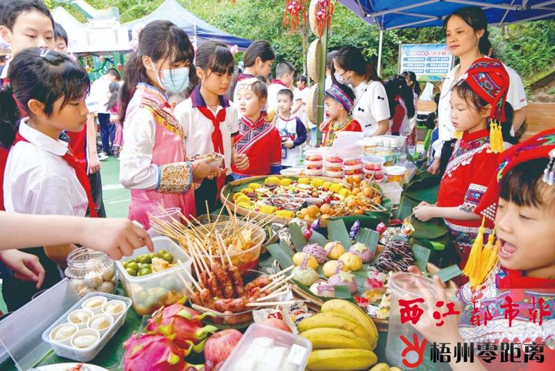 4月17日,新興二路小學同學在“主營”欽州特產(chǎn)的攤點挑選小吃。當天上午,梧州市長洲區(qū)組織轄區(qū)34所中小學同步舉辦慶祝建區(qū)20周年暨2023年“壯族三月三”歡慶活動。該活動以“潮聚‘三月三’,長洲展風采——中華民族一家親,萬人頌唱古詩詞”為主題,營造了濃厚的節(jié)日氛圍,讓學校師生共同感受傳統(tǒng)文化魅力,共享民族團結(jié)盛宴。西江都市報記者 陳凡 攝