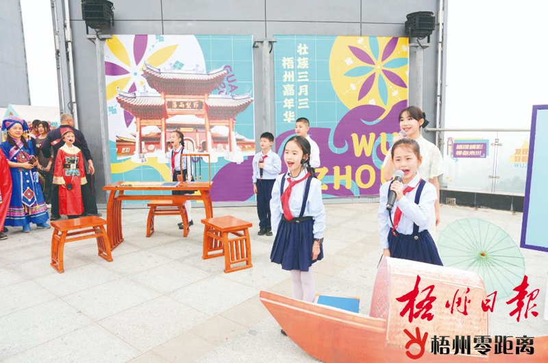 在童聲詩詞朗誦展演區域,由粵語童謠和明朝兩廣總督府歷史故事融合而成的詩詞朗誦節目《贊總府》正在傾情上演,觀看節目的市民里里外外圍了好幾個大圈。來自市第二實驗小學的同學們在桌子和小船等道具旁,邊做動作邊朗誦。同學們用膾炙人口的粵語誦唱,以及傳神到位的肢體語言,將梧州騎樓城、鴛鴦江、明朝兩廣總督府等嶺南特色歷史文化生動再現。市第二實驗小學少先隊大隊輔導員邱娟說,通過展演,讓同學們更深刻地感受嶺南文化和梧州歷史,培養他們熱愛家鄉、民族團結的美好情感。