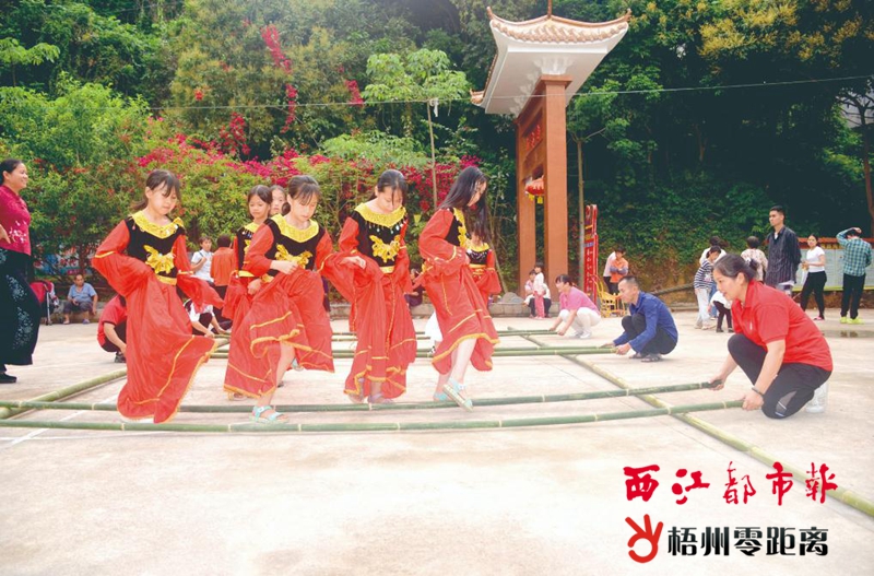 在梨木鎮五星公社生態旅游區,人們在跳竹竿舞。龐廣蛟 攝