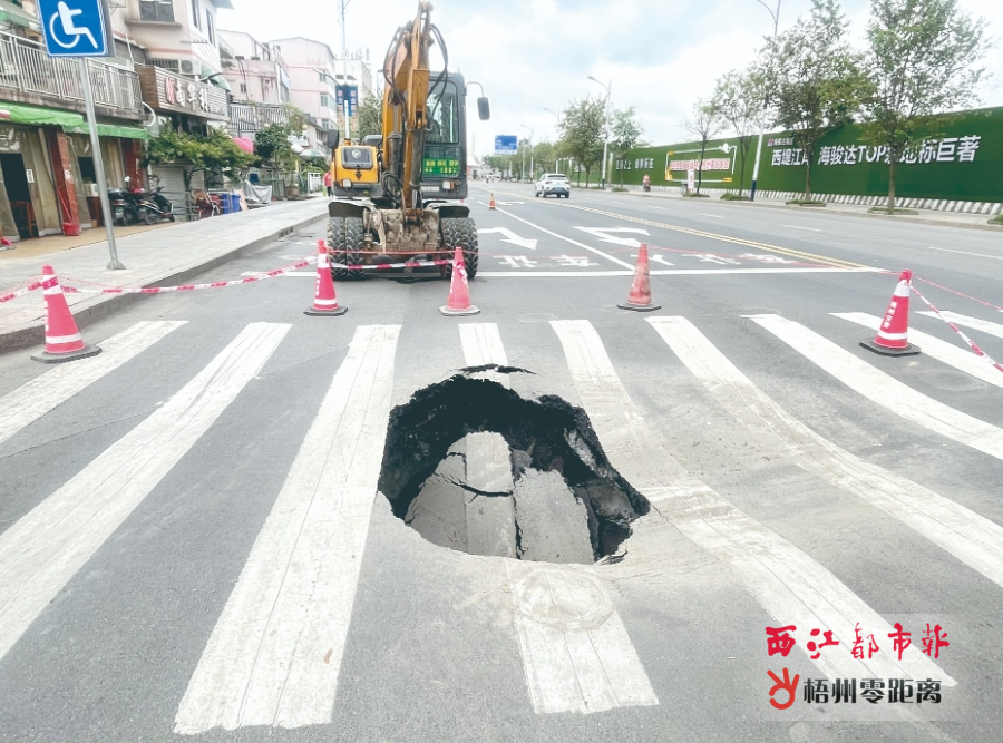 梧州零距離網-西江都市報訊(記者 鄧超妍) 5月4日,長洲區新湖一路(南段)道路發生路面塌陷,經有關部門初步排查,路面塌陷原因是地下市政支渠年久失修出現滲水現象所致。有市民提出疑問,該段道路全長四五百米,為何短時間內再次出現地陷?