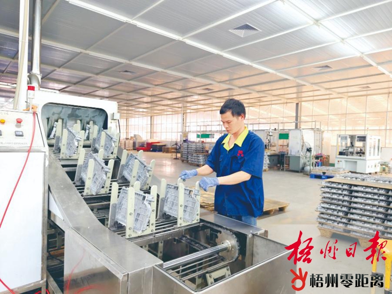 5月6日,在鴻圖壓鑄公司加工車間,工人將產(chǎn)品整齊擺放在清洗生產(chǎn)線上。梧州日報記者 蒙敏瑩 攝