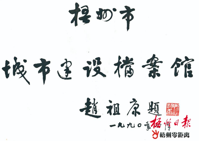 1990年,90歲高齡的趙祖康雖身體抱恙,但仍心系梧州城市建設,知道梧州市保存著他參與梧州城建發展的檔案,遠在上海的趙祖康先生留下了“梧州市城市建設檔案館”館牌手跡,成為梧州市城市建設檔案館館藏物件。