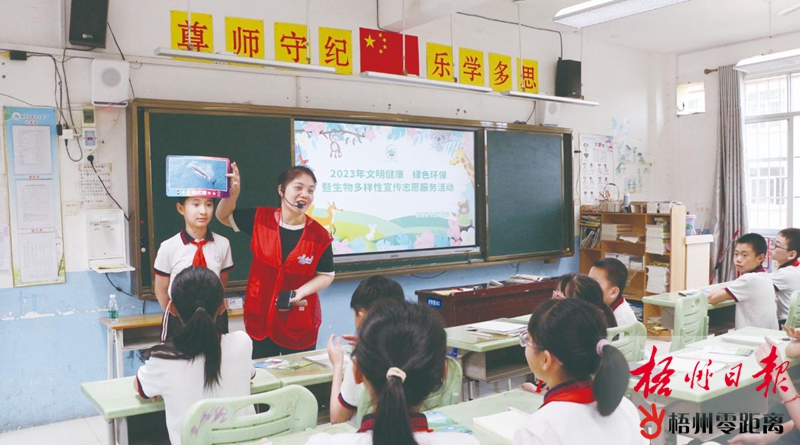 梧州零距離網(wǎng)-梧州日?qǐng)?bào)訊 為深入學(xué)習(xí)貫徹習(xí)近平生態(tài)文明思想,進(jìn)一步提升公眾生物多樣性保護(hù)意識(shí),營(yíng)造積極參與生物多樣性保護(hù)的濃厚氛圍,近日,市生態(tài)環(huán)境局組織志愿者來(lái)到市新興小學(xué),開(kāi)展“文明健康綠色環(huán)保”暨生物多樣性宣傳志愿服務(wù)活動(dòng),讓更多的學(xué)生了解生物多樣性現(xiàn)狀,喚起學(xué)生對(duì)地球大家庭的關(guān)愛(ài)。