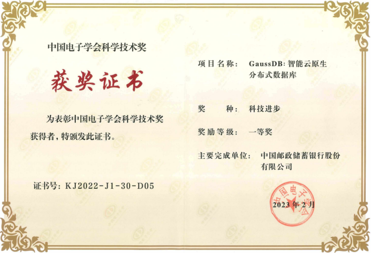 近日,在2022年中國電子學會科學技術獎的評選中,中國郵政儲蓄銀行憑借高斯數據庫(GaussDB)在新一代個人業務核心系統的全面應用與深度聯合創新,獲中國電子學會科學技術獎科技進步一等獎。