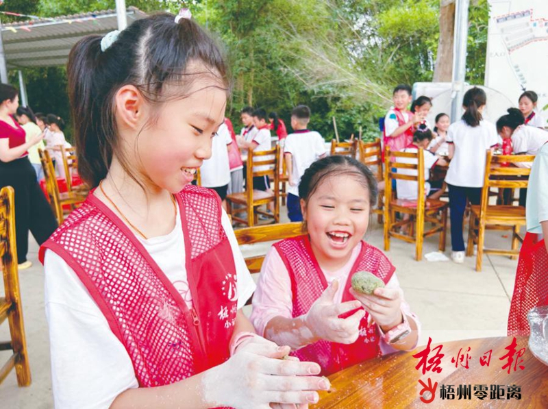 “艾草糍粑具有補氣養(yǎng)血、健脾暖胃等功效,是南方很常見的一種小吃……”學生們邊聽研學老師介紹,邊開始學習制作艾草糍粑。研學老師耐心地向?qū)W生們展示做艾草糍粑的步驟。