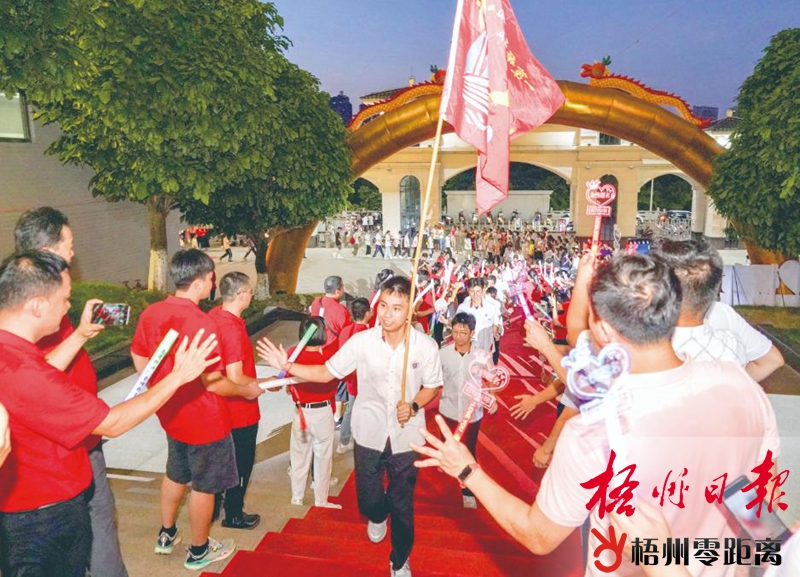 6月3日,梧州高級中學高三年級教師同學生擊掌,為其加油助威。當天傍晚,梧州高級中學1000多名高三年級學生揮舞班旗宣讀高考宣言,邁過寓意金榜題名的“龍門”,與高三年級教師一一擊掌,以飽滿精神狀態迎接高考。梧州日報記者 陳凡 攝