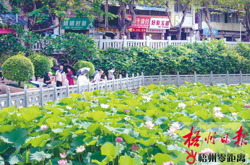 6月5日,市民在潘塘公園觀賞荷花。近日,我市的荷花徐徐綻放,為城市增添一份別樣的色彩。梧州日報記者 楊揚 攝