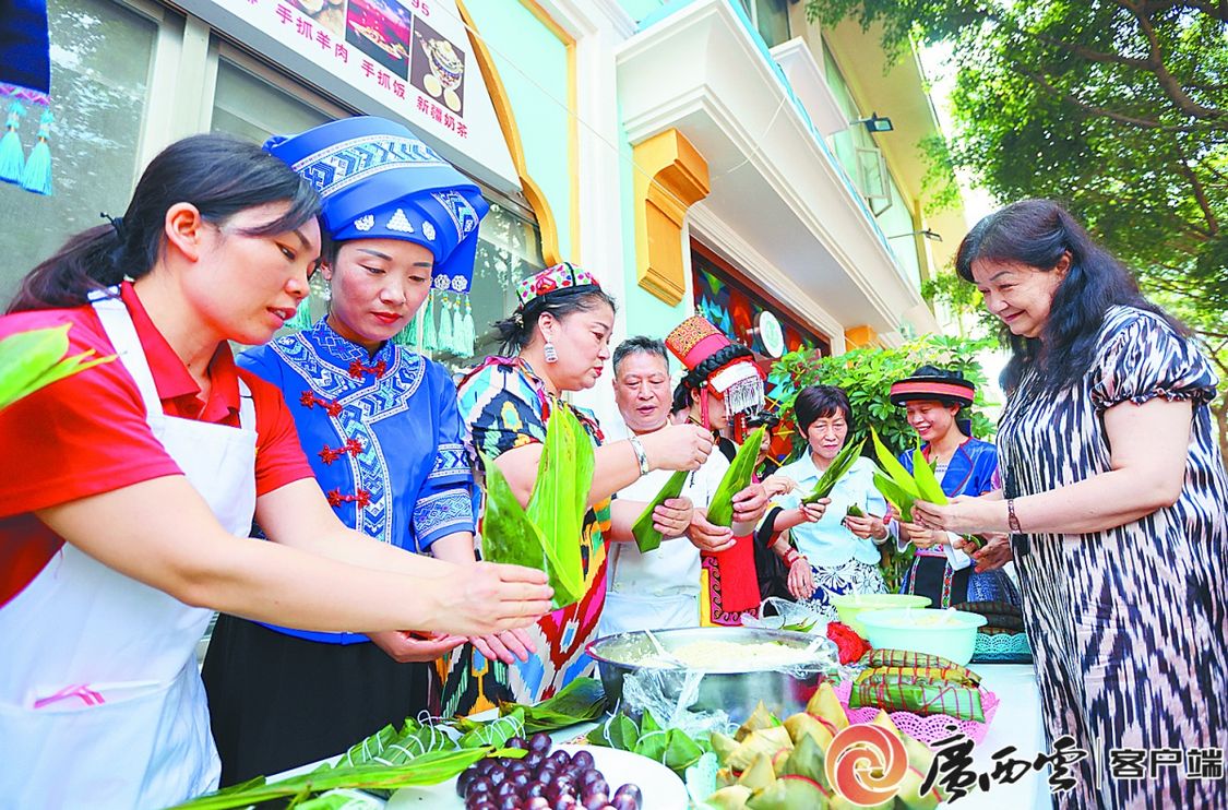6月20日,南寧市興寧區(qū)望仙坡社區(qū)各族干部群眾和新疆在邕少數(shù)民族同胞舉行聯(lián)誼活動(dòng),一起包粽子、烤全羊,分享民族美食,并開展民族服飾秀、民族歌舞展演以及現(xiàn)場(chǎng)書畫展等活動(dòng),迎接即將到來的端午節(jié)和古爾邦節(jié),增進(jìn)各族同胞交往交流交融。圖為各族同胞一起包粽子。記者 覃文武 通訊員 黃云 攝