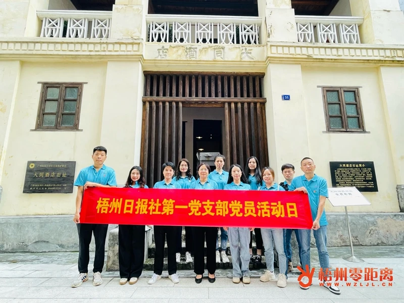 梧州日報(bào)社第一黨支部黨員在大同酒店舊址參觀,重溫周恩來在梧州開展革命工作的場景故事。