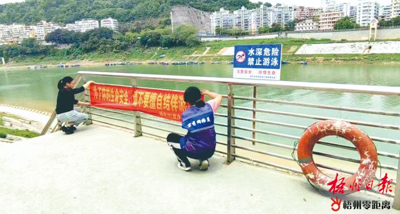 社區工作人員在江邊掛起防溺水宣傳橫幅。(桂北社區供圖)