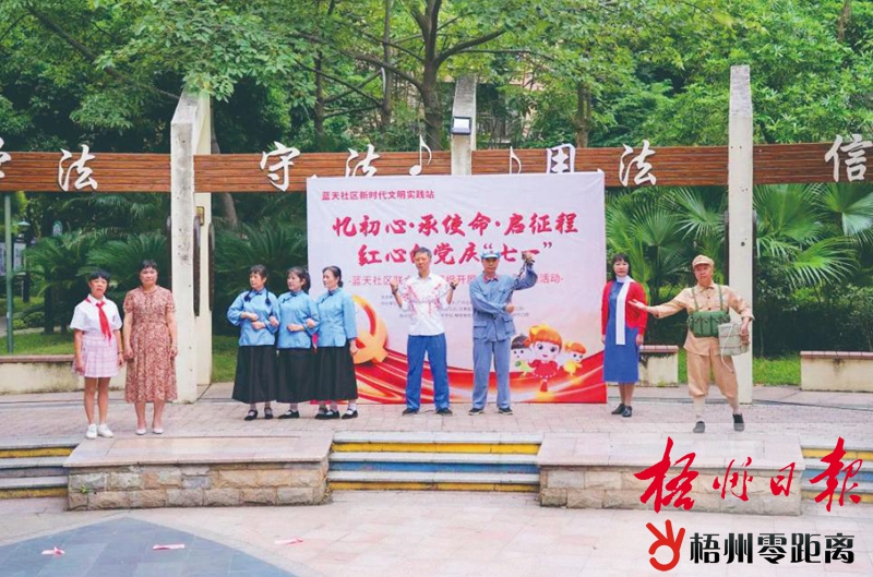 梧州零距離網-梧州日報訊為激發黨員群眾愛黨愛國干事創業熱情,在萬秀區新時代文明實踐中心的指導下,近日,萬秀區角嘴街道藍天社區新時代文明實踐站攜手城區相關單位聯合開展“憶初心承使命啟征程紅心向黨慶‘七一’”主題活動,共同回顧黨的光輝歷程,謳歌黨的豐功偉績,向黨致敬。