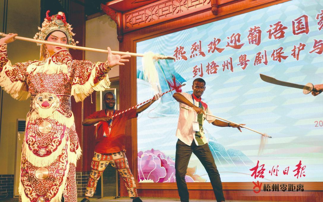 7月22日,葡語國家新聞官員和記者來到梧州粵劇保護與傳承基地,學習動作身段,體驗粵劇文化。梧州日報記者 陳凡 攝