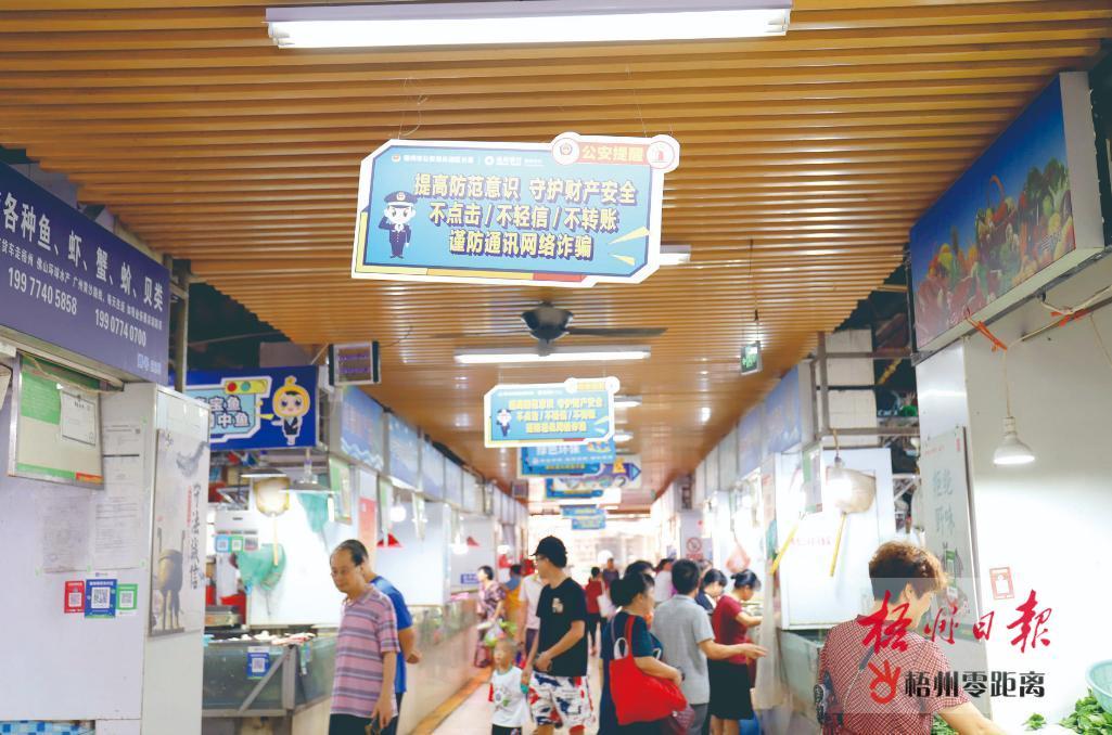 為進一步增強市民群眾防范電信詐騙“免疫力”,擴大反電信詐騙宣傳覆蓋面,近日,梧州市首個“反詐菜市”在長洲區大塘市場正式亮相。常見的詐騙套路和反詐方式被編成順口溜,這些創意標語口號懸掛在攤位上方,既詼諧又幽默,讓前來買菜的市民眼前一亮。70多歲的李大姐說,買菜時一看到這些反詐標語,就能提醒老年人不要貪圖小利、不要透露個人及家人信息、不要輕易轉賬匯款,增強防范意識,遠離詐騙陷阱,也讓反詐宣傳入腦入心。