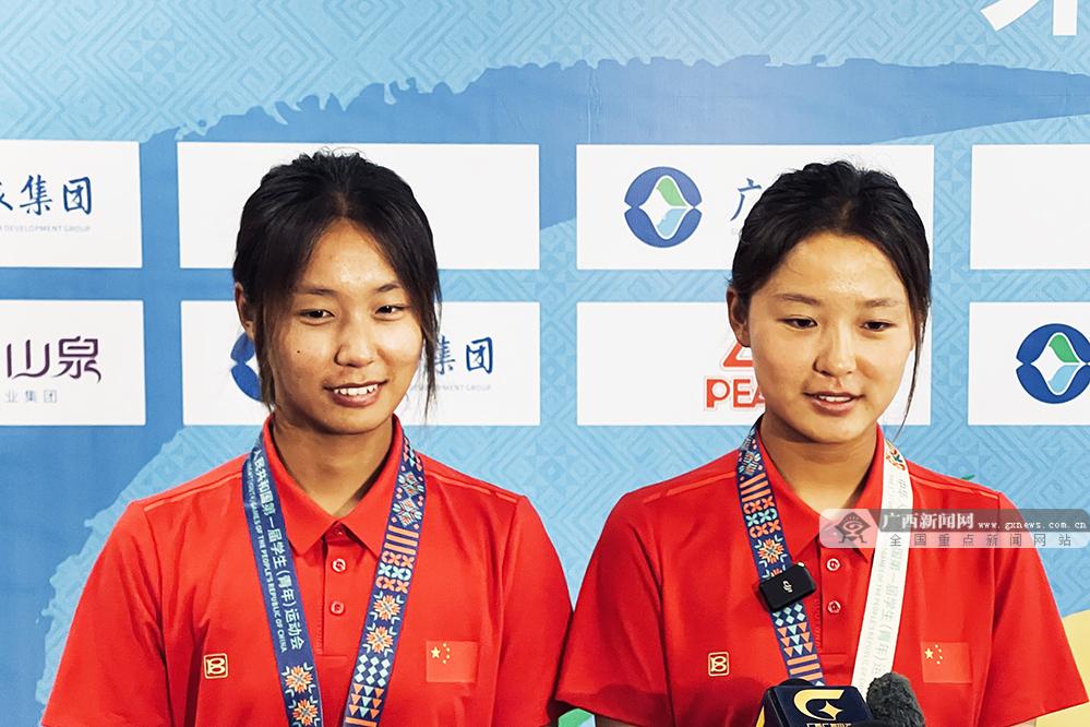 雙胞胎姐妹花張文姚(右)、張文彥分別收獲女子長板銀牌、銅牌。廣西新聞網記者 金翔義 攝