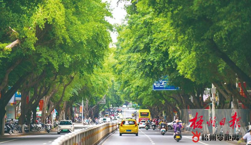 蝶山二路潘塘段,行道樹的樹冠和潘塘環(huán)湖道路的綠化連成一片。