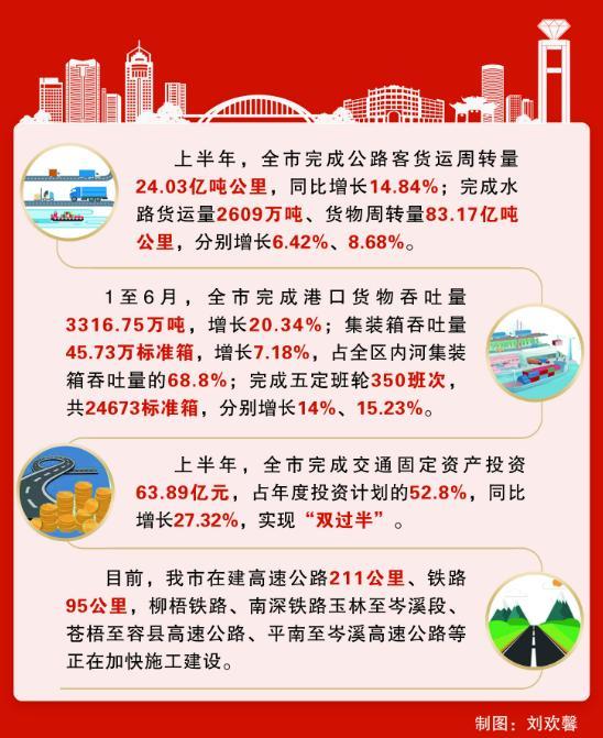 今年以來,市交通運輸系統聚焦“交通強市”戰略,全力服務重大交通項目,奮力推進“兩灣”聯動樞紐港各項建設,全面提升行業監管服務,全市完成交通固定資產投資實現“雙過半”,多項交通運輸經濟運行指標完成良好,排名全區靠前,全市交通運輸工作取得良好成效。上半年,全市完成交通固定資產投資63.89億元,占年度投資計劃的52.8%,同比增長27.32%,實現“雙過半”。