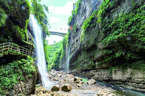 “哇!瀑布!”未見瀑布,就已聽到一片驚呼。緊走幾步,眼前出現(xiàn)一條白練沿著山壁傾瀉而下,奔流至云龍河中,激起清涼的水花。置身地縫之中,只見一道又一道瀑布從天而降,真有“疑是銀河落九天”之勢。
