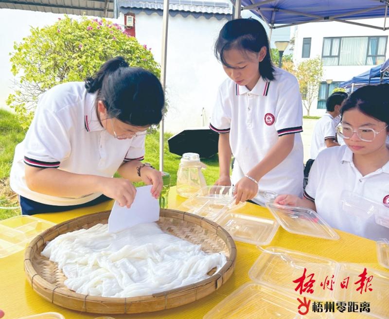 “梧州河粉歷史久遠,美名遠揚。今天我們就去了解制作河粉的米漿是怎樣研磨出來的?!?在研學老師帶領下,學生們帶著好奇,來到了河粉制作體驗區。他們圍著石磨站成一個圈,有的負責加米,有的負責添水,有的負責研磨,相互配合。
