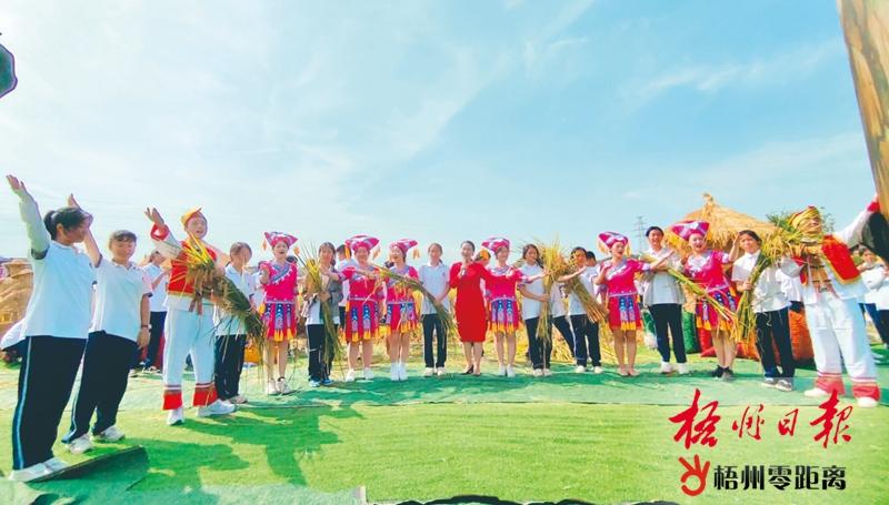 市文聯組織的文藝志愿者們和學生們一起縱情歡歌慶祝豐收。黃丹婷 攝