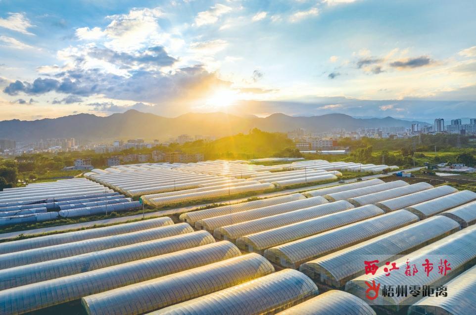 近日,無人機視角下的蒙山縣蒙山鎮(zhèn)文平村大棚蔬菜基地被晚霞映照得美輪美奐 。