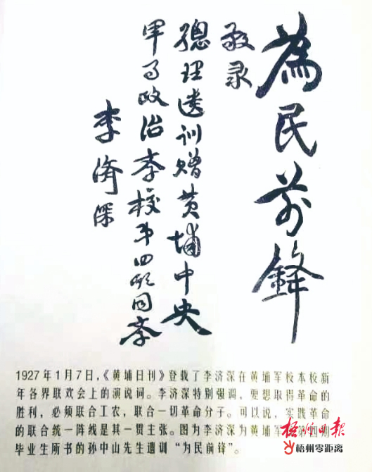 李濟深為黃埔軍校第四期畢業生所書的孫中山遺訓“為民前鋒”。 (梧州市中華文化促進會供圖)