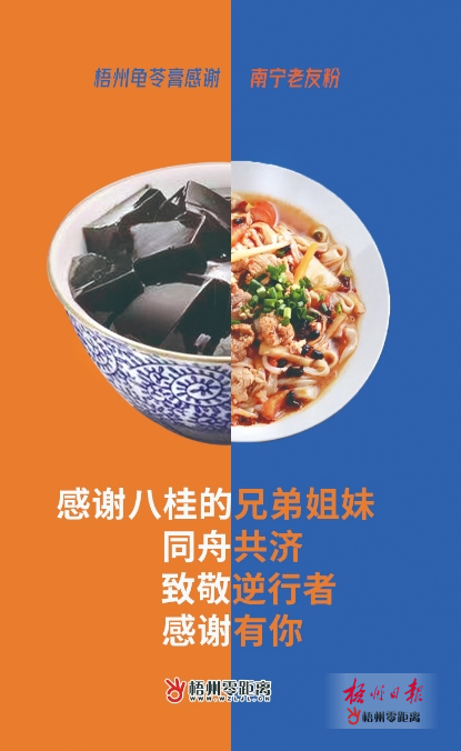 抗疫期間,作為梧州傳統(tǒng)特產(chǎn)的龜苓膏因?yàn)榕c“歸零高”同音,被賦予特殊意義。因此,在作品標(biāo)題上,我們特意突出“龜苓膏”這個(gè)暗含梧州人樂觀向上精神的元素;在海報(bào)編排上,以梧州龜苓膏與南寧老友粉的互動(dòng)作為壓軸,從而鮮明點(diǎn)出作品主題:感謝八桂的兄弟姐妹,同舟共濟(jì)!