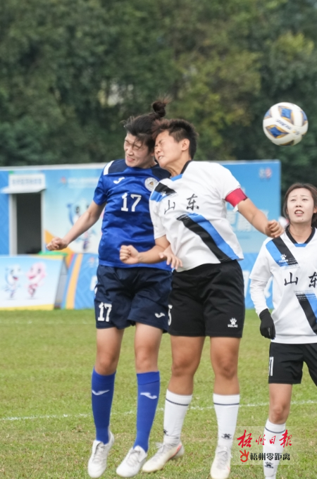 11月7日,在學青會(校園組)足球大學女子組首日比賽中,山東隊隊員和河北隊隊員爭搶頭球。梧州日報記者 楊揚 攝