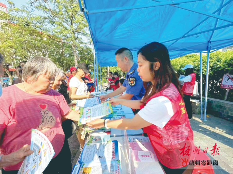 志愿者向市民宣講創建文明城市、治安、垃圾分類、文明養犬等知識。