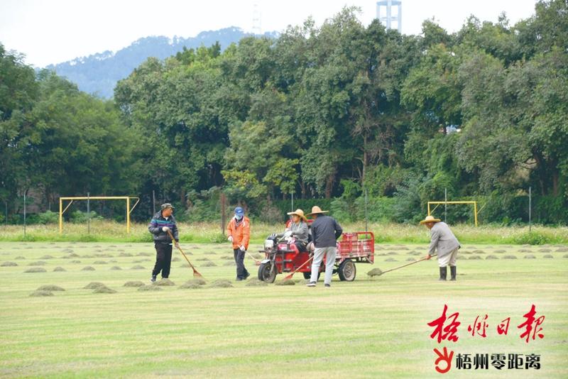 場(chǎng)地養(yǎng)護(hù)人員在平整草地。梧州體訓(xùn)基地供圖