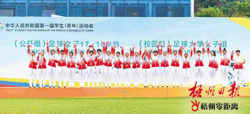 11月14日,北京隊(duì)隊(duì)員領(lǐng)獎(jiǎng)后歡呼慶祝奪冠。當(dāng)日,第一屆全國(guó)學(xué)生(青年)運(yùn)動(dòng)會(huì)(校園組)足球大學(xué)女子組比賽所有賽事結(jié)束,北京隊(duì)、上海隊(duì)、湖北隊(duì)分獲冠亞季軍。 梧州日?qǐng)?bào)記者 何鎏 攝