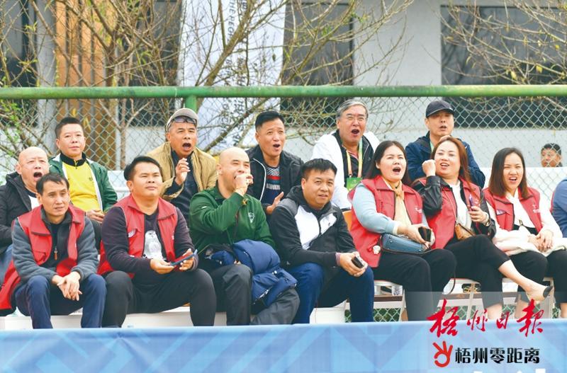 球迷在場(chǎng)邊高喊加油口號(hào)。梧州日?qǐng)?bào)記者 何鎏 攝