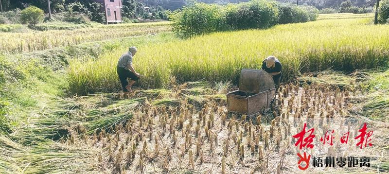 蒼梧縣京南鎮(zhèn)寺垌村群眾穿梭稻田間收割稻谷。 廖偉 黎妹 攝