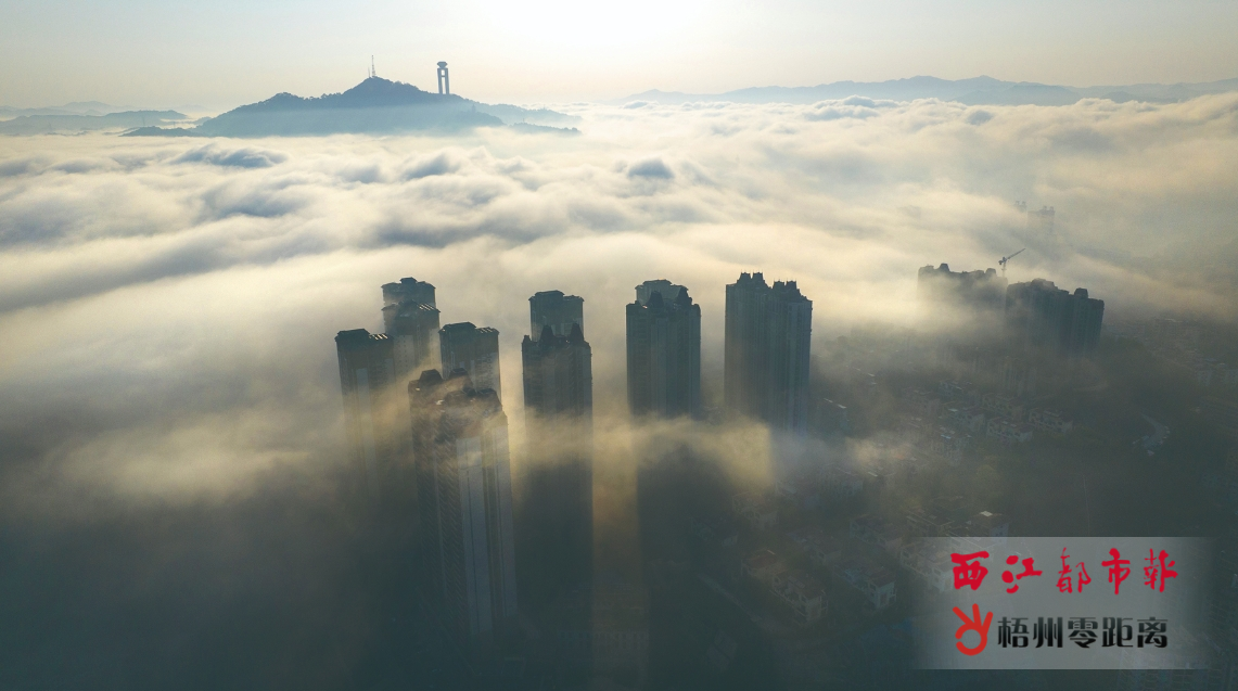 11月21日,梧州市區驚現平流霧奇觀,城市的建筑在霧海之中若隱若現,夢幻無比,蔚為壯觀。何華文 攝
