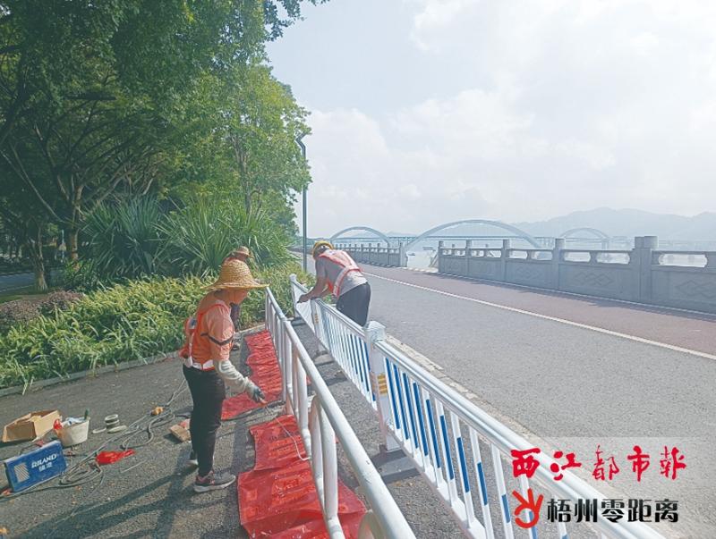 11月10日,工人在西堤公園一處入口安裝欄桿,限制電動兩輪車開上步道,進一步規范公園秩序,保障市民安全。西江都市報記者 李鴻榮 攝
