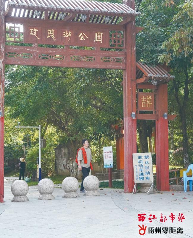 11月24日,玫瑰湖公園北側入口放置標識牌和阻車石,禁止機動車和非機動車進入公園。 西江都市報記者 陳凡 攝