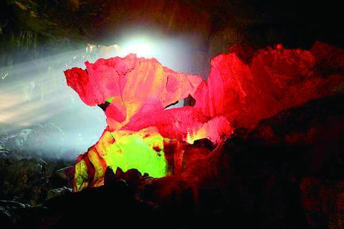 “瓜果滿天”是由糾結(jié)飽滿的鐘乳石布滿整個洞廳的頂部,斜掛而下,如荔枝,如菠蘿,如葡萄,五顏六色的燈光打在上面,美不勝收。