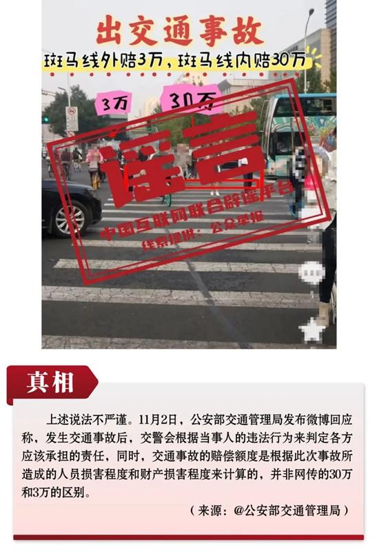 謠言4:行人發生交通事故,斑馬線外賠償3萬、斑馬線內賠償30萬?