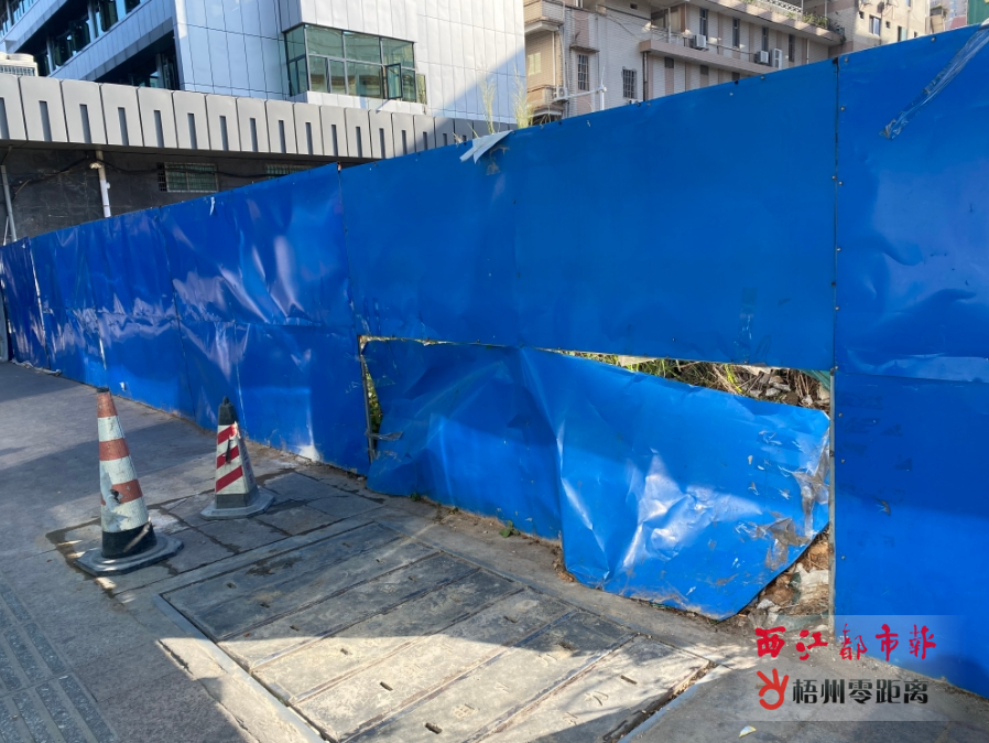 在市振興小學與新興一路之間的圍蔽區域,鐵皮圍擋出現了幾處破損。西江都市報記者 黃子萃 攝