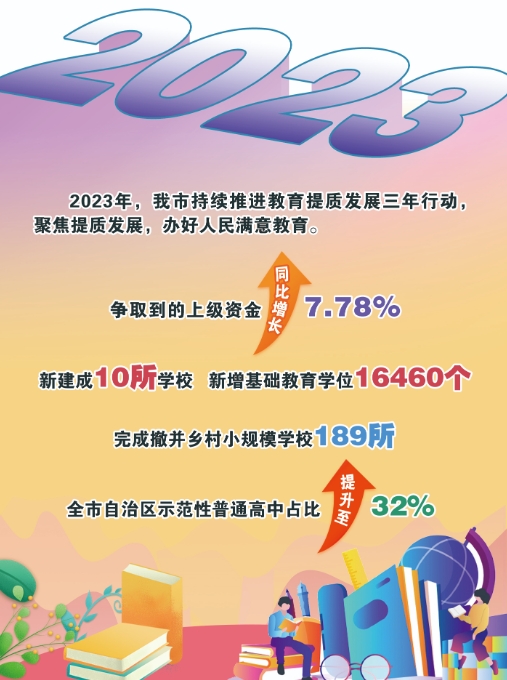 一件件教育惠民實(shí)事、一組組亮眼數(shù)據(jù),是我市教育工作高質(zhì)量發(fā)展、教育事業(yè)蓬勃發(fā)展的真實(shí)寫照。我市聚焦提質(zhì)發(fā)展,辦好人民滿意教育,入選了“2023年度梧州十大新聞”。