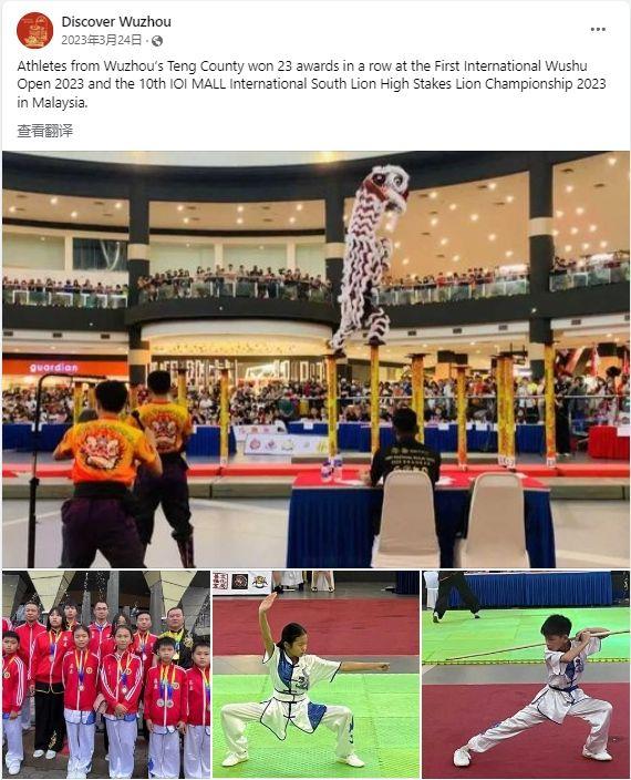 ↑“Discover Wuzhou”上線當天發布帖文,通報梧州市藤縣運動健兒在馬來西亞參加2023第一屆國際武術公開賽和2023第十屆IOI MALL國際南獅高樁獅王爭霸賽并連奪23個獎項。