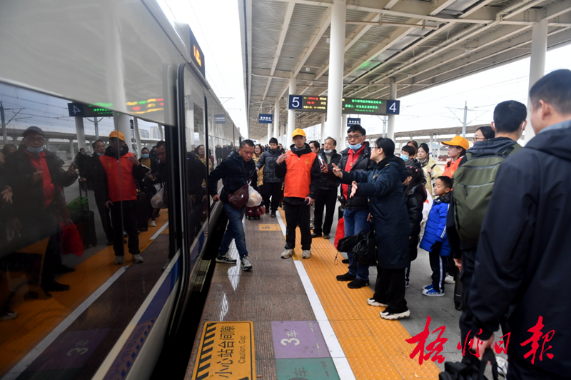 1月26日,在梧州南站站臺,乘客在志愿者的引導下有序上下車。