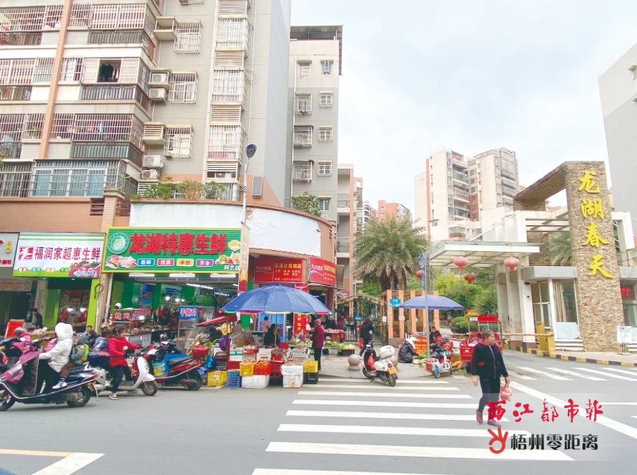 龍湖春天小區(qū)大門一側(cè)臨街商鋪售賣生鮮肉類、果蔬、糧油,人行道上經(jīng)常有流動攤販擺賣,此處就像一個小型菜市。本報記者 黃子萃 攝