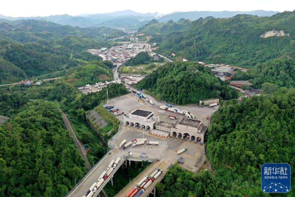 ↑繁忙的廣西憑祥友誼關口岸(無人機照片) 新華社記者曹祎銘 攝