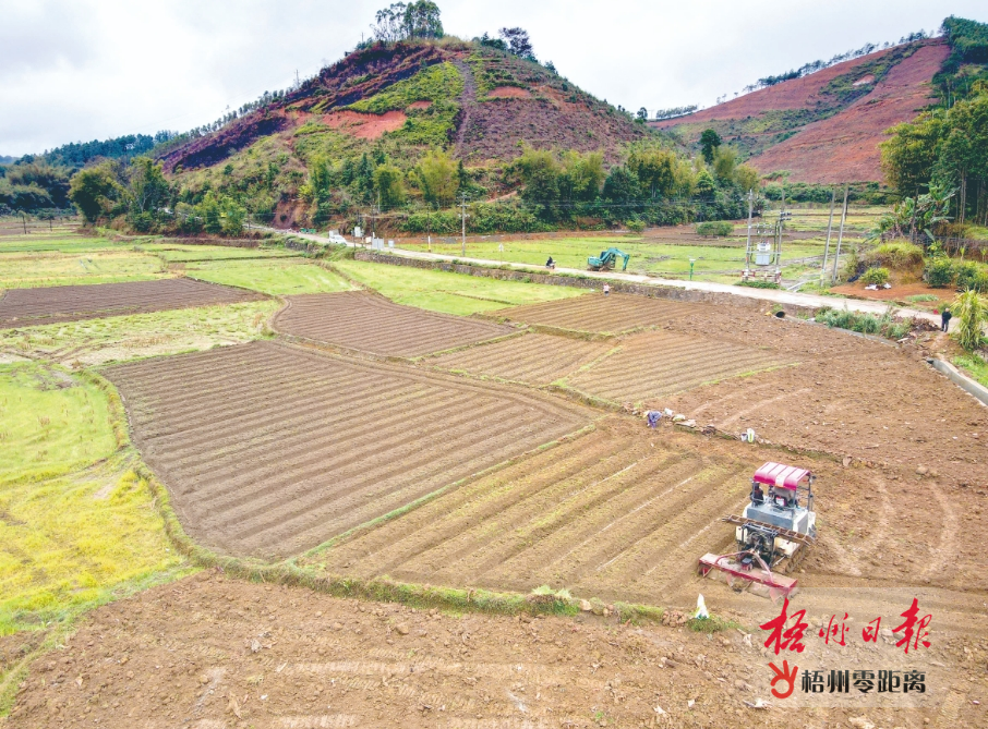 2月29日,寒潮春雨中,藤縣埌南鎮(zhèn)雙底村村民在田間用拖拉機(jī)犁地,在田間留下縱橫交錯的線條,喚醒沉睡一冬的土地,為春種做好前期準(zhǔn)備。梧州日報