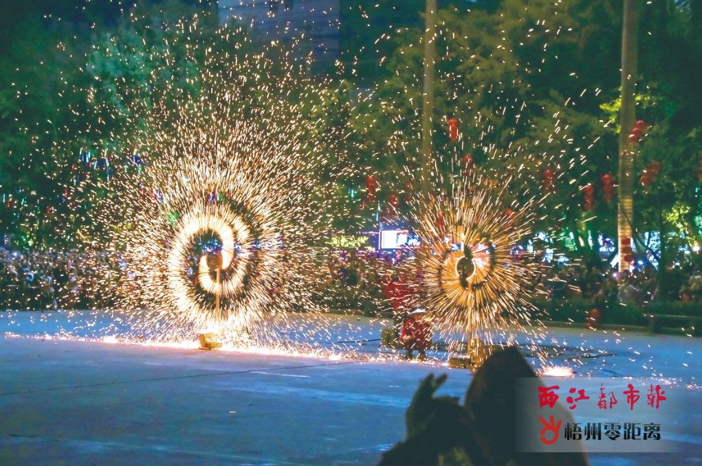 3月2日晚,民間傳統民俗“夜宴”——打鐵花在藤縣藤州文化廣場火熱上演。在一聲聲吆喝聲中,打花藝人將1600℃左右的鐵水潑向空中并用力擊打,剎那間散作滿天“繁星”,金光閃爍,絢麗奪目。黃群禮 韋顯蘭 攝